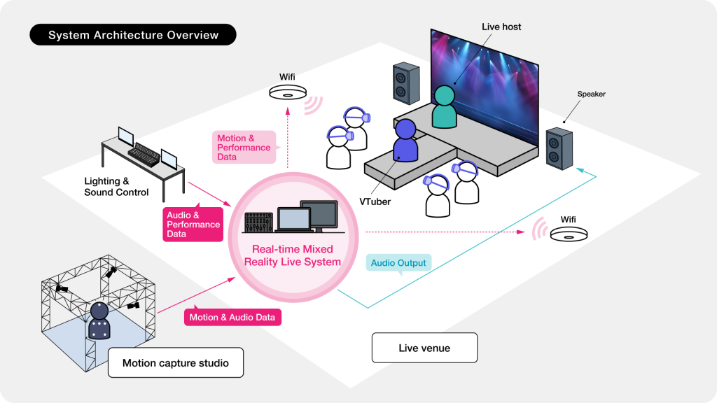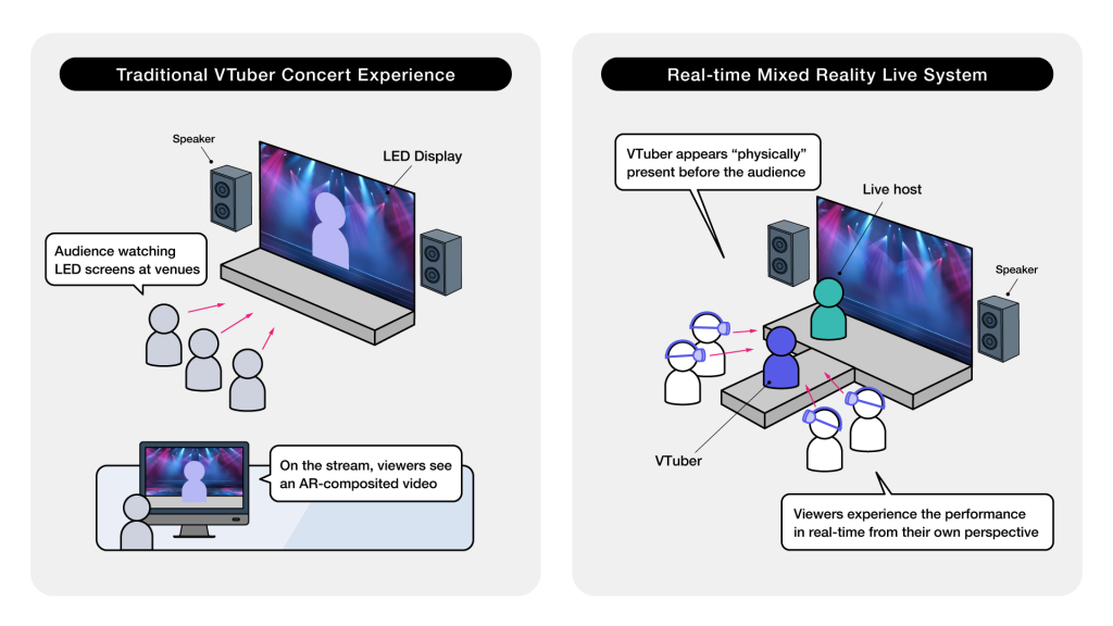 The system consists of two core components developed specifically for VTuber performances: a specialized transmission system and an MR compositing system that creates the impression of VTubers existing in the physical space.